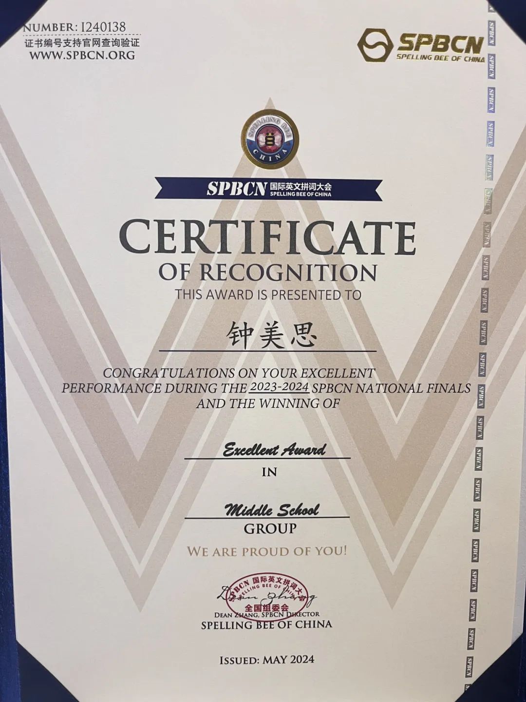 作為浙江省個人賽區(qū)派出選手最多的學(xué)校,我們有4名優(yōu)秀選手在五一期間前往北京參加了全國總決賽。在全國Spelling Bee個人賽初中組的百人角逐中,經(jīng)過多輪激烈競爭,我校的4名選手最終躋身全國68強,斬獲卓越獎項,為他們的學(xué)習(xí)生涯又增添了一枚重要的獎杯!