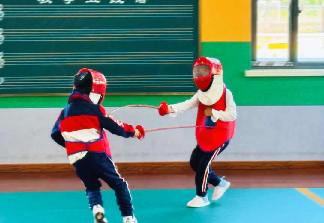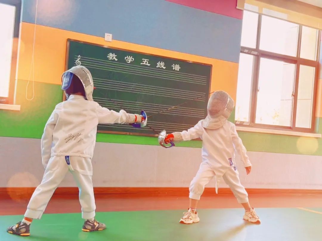 擊劍,輕如蝶舞,疾若蜂刺,是速度力量與智慧的較量,在教練的指導(dǎo)下,孩子們手揮劍,腦思考,他們?cè)谙硎軗魟啡さ耐瑫r(shí),也在感受著同伴之間的搏斗,體驗(yàn)著成功的喜悅。